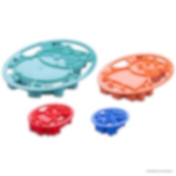 Das Set enthält vier verschiedene Größen: Papa Wutz (14 x 12,5 x 2 cm), Mama Wutz (11,5 x 10 x 2 cm), Peppa Wutz (6,5 x 5,5 x 2 cm) und Schorsch Wutz (4,5 x 4,5 x 2 cm), alle hergestellt aus nachhaltigem Kunststoff.