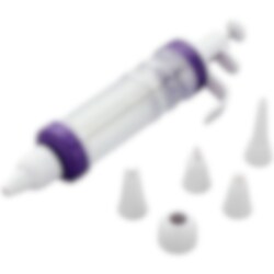Der durchsichtige Körper fasst ca. 1-1½ Cups Icing, Crème, Sahne oder womit auch immer Sie spritzen möchten. Die 5 dazugehörigen Tüllen machen das Dekorieren einfach: Eine ist zum Befüllen von Cupcakes und anderen Backwaren, eine ist klassisch rund, einmal Blattform, einmal Sternförmig und einmal für Blüten. Außerdem können auch die Standard Wilton Tips beim Dessert Decorator Plus benutzt werden, somit sind Ihre Möglichkeiten quasi unbegrenzt. Die Tüllen sind einfach zu wechseln, also können Sie auch die selbe Farbe Icing nutzen, um vielleicht erst Sterne und dann Punkte zu machen. Einfach drehen und austauschen.