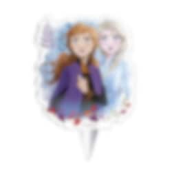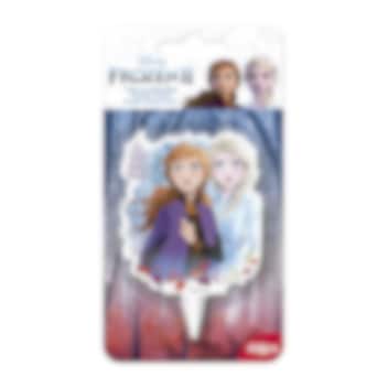 Tortenkerze mit Motiven von Anna und Elsa auf weißem Hintergrund aus Disneys Film Frozen 2. Die perfekte Dekoration für die Frozen-Mottoparty. Die Tortenkerze ist 7,5 cm hoch.