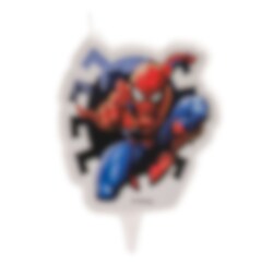 Coole Tortenkerze mit Motiv und Form des Superhelden Spiderman zum Dekorieren der Geburtstagstorte. Die Kerze ist etwa 7 cm hoch und 5,5 cm breit.