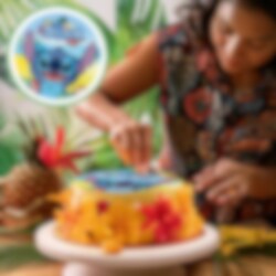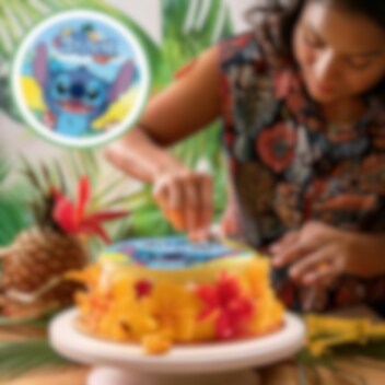 Tortenaufleger aus Fondant mit Lilo & Stitch. Der Tortenaufleger kann direkt auf die Torte gelegt werden und hat einen schärferen Druck als ein Tortenaufleger aus Oblaten. Der Tortenaufleger hat einen Durchmesser von etwa 20 cm. Mit Süßungsmitteln.