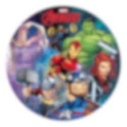 Tortenaufleger aus Fondant mit Avengers. Der Tortenaufleger kann direkt auf die Torte gelegt werden und hat einen schärferen Druck als ein Tortenaufleger aus Oblaten. Der Tortenaufleger hat einen Durchmesser von ca. 20 cm. Mit Süßungsmitteln.