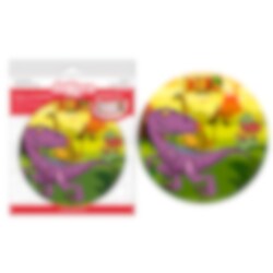 Tortenaufleger aus Fondant mit Dinosaurier. Der Tortenaufleger kann direkt auf die Torte gelegt werden und hat einen schärferen Druck als ein Tortenaufleger aus Oblaten. Der Tortenaufleger hat einen Durchmesser von ca. 20 cm. Mit Süßungsmitteln.