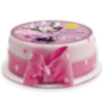 Tortenaufleger aus Fondant mit Minnie Maus. Der Tortenaufleger kann direkt auf die Torte gelegt werden und hat einen schärferen Druck als ein Tortenaufleger aus Oblaten. Der Tortenaufleger hat einen Durchmesser von ca. 15,5 cm. Mit Süßungsmitteln.