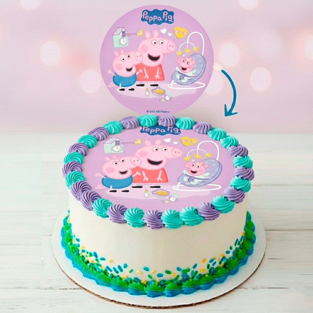 Machen Sie den Geburtstagskuchen noch lustiger mit Peppa Wutz! Dieser hübsche Tortenaufleger aus Oblaten ist mit Peppa zusammen mit ihrer Familie in einem verspielten und bunten Motiv verziert, das perfekt zu einer Peppa Wutz-Geburtstagsfeier passt.