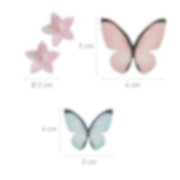 Verziere Torten, Cupcakes und Gebäck mit diesen wunderschönen und essbaren Oblaten-Dekorationen. Das Set enthält 35 kleine Blumen, 2 blaue Schmetterlinge und 2 größere rosa Schmetterlinge, die zusammen eine elegante und märchenhafte Optik schaffen. Perfekt für Geburtstage, Hochzeiten oder andere festliche Anlässe, bei denen das gewisse Extra zählt!