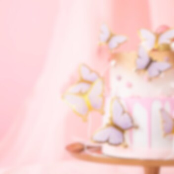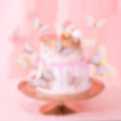 10 schöne Tortendekorationen in Form von lila Schmetterlingen mit eleganten, goldfolierten Details. Das Set enthält 10 flexible, dünne Stäbe und 10 Klebepunkte, mit denen Sie die Schmetterlinge einfach auf Ihrem Kuchen befestigen und arrangieren können. Die Größe der Schmetterlinge variiert zwischen 5 und 9 cm.