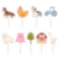 9 Tortendekorationen im Bauernhof-Thema, die Kuchen, Muffins oder andere Backwaren für den Kindergeburtstag besonders festlich gestalten. Das Set enthält mehrere niedliche Motive wie Pferd, Huhn, Kuh, Traktor, Schaf, Schwein, Baum, Scheune und Gans, was perfekt zu einem Geburtstag mit Bauernhof-Thema passt. Die Dekorationen sind aus Papier und Holz gefertigt und circa 11 cm hoch. Sie sind ein verspieltes und dekoratives Detail, das den Backwaren schnell eine besondere Note verleiht.