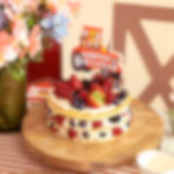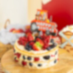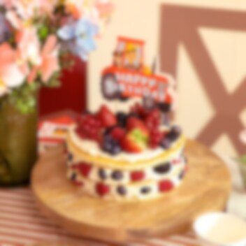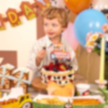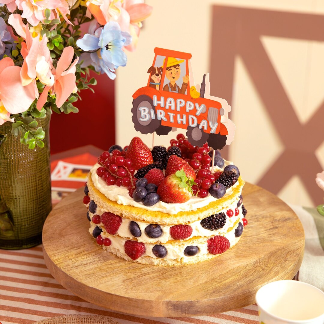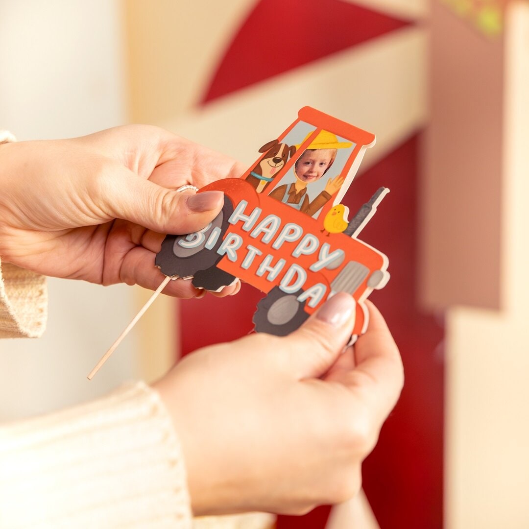 Tortendekoration in Form eines Traktors, die einer Torte zum Kindergeburtstag eine lustige und persönliche Note verleiht. Die Dekoration trägt den Text 'Happy Birthday' und verfügt über eine ausgesparte Öffnung, in die Sie ein eigenes Foto einfügen können, was sie zu einer besonders schönen Ergänzung für eine Geburtstagsparty mit Bauernhof-Thema macht. Befestigen Sie das Bild in der Aussparung. Die Tortendekoration wird mit Holzstäbchen geliefert und misst 11 x 13 cm ohne Stäbchen.