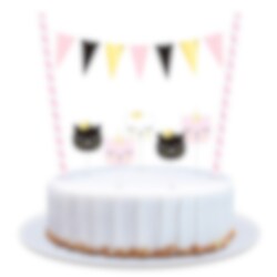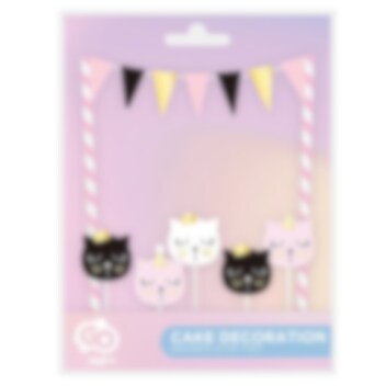 Niedliches Tortendekoration-Set. Im Paket sind 5 Tortenkerzen in Form von Katzenköpfen in den Farben Rosa, Weiß und Schwarz enthalten. Zwei rosa gestreifte Pappstrohhalme mit einer Wimpelkette.
