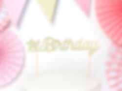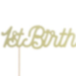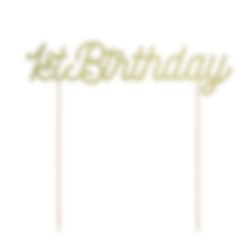 Sehr schöne Tortendekoration mit Motiv des Textes "1. Geburtstag“ in gold-glitzernder Farbe. Dekorieren Sie den Kuchen damit, um einen schönen Effekt zu erzielen, wenn es Zeit für die 1. Geburtstagsfeier ist. Die Dekoration ist etwa 20 x 20 cm groß.