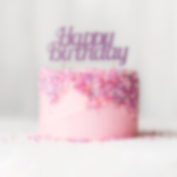 Tortendekoration mit dem Text "Happy Birthday" in glitzernd Pink. Dekorieren Sie die Torte damit, wenn eine Geburtstagsfeiern ansteht, um die Torte besonders schick zu machen. Die Dekoration ist etwa 10 x 14 cm groß.