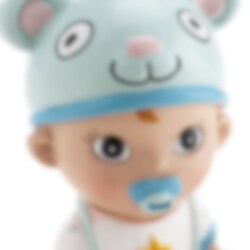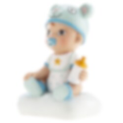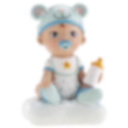 Diese niedliche Tortenfigur stellt einen kleinen Jungen dar, der auf einem blauen Kissen sitzt und eine Babyflasche in der Hand hält. Perfekt zum Dekorieren von Torten bei Taufen, Namensgebungen oder Babyshowers.