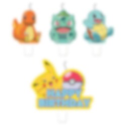 4 Tortenkerzen mit Motiven von Pokeballs, Pikachu und anderen Charakteren aus Pokémon. Dekorieren Sie die Torte damit. Eine Kerze ist größer, etwa 8 cm breit, und drei sind kleiner, etwa 3,5 cm x 3,5 cm groß.