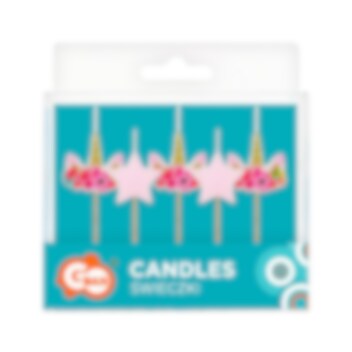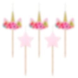 5 süße Tortenkerzen mit Motiven aus Einhornhörnern und rosa Sternen. Diese Kerzen sind perfekt für eine Einhorn-Mottoparty. Die Tortenkerzen sind zwischen 4-8 cm groß.