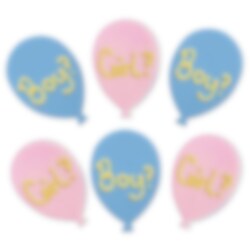 6 Zuckerdekorationen in schönen Pastellfarben mit der Aufschrift "Boy?“ und "Girl?“ in Gold. Dekorieren Sie damit die Torten oder die Backwaren, wenn es Zeit für eine Gender-Reveal-Party ist.