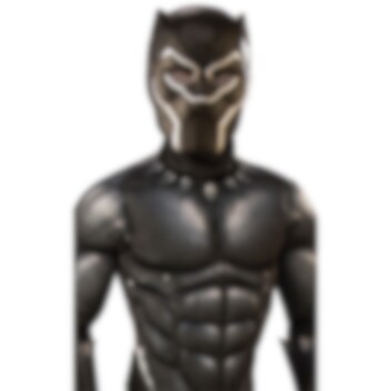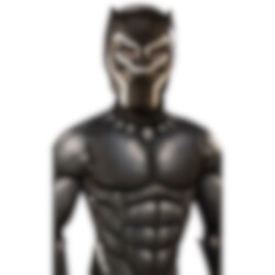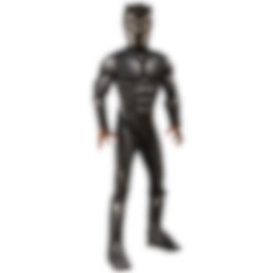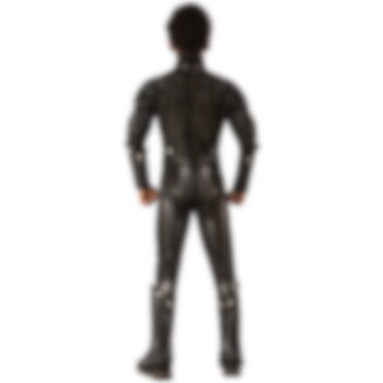 Black Panther Movie Deluxe maskeraddräkt inkluderar en delvis vadderad jumpsuit med muskler. Dräkten är öppen under fötterna så att man kan ha skor på sig. Dräkten stängs igen längs ryggen.