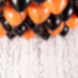 Stilvolles Ballonset in den Farben Schwarz und Orange, mit dem Sie Ihre Decke für Halloween dekorieren können.