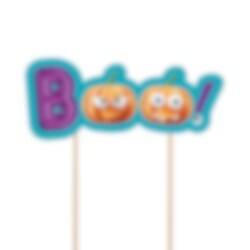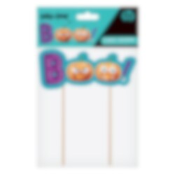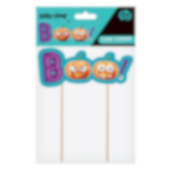 Ein cooler Tortentopper mit dem Text "BOO“. Stilvoll zum Dekorieren der Backwaren für Halloween. Der Tortentopper besteht aus Pappe und sitzt auf zwei Stäbchen aus Holz. 15 x 18 cm groß.