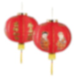 Feiern Sie das chinesische Neujahr mit dieser runden chinesischen Laterne mit einem Durchmesser von 40 cm. Es ist rot mit asiatischen Zeichen und traditionellen Figuren auf beiden Seiten, sowie mit Goldfäden. Die Laterne ist aus Pappe gemacht und eignet sich perfekt zum Aufhängen sowohl im Innen- als auch im Außenbereich.