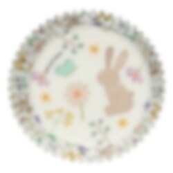 48 Muffinförmchen in weißer Farbe und mit dem Motiv eines niedlichen Kaninchens zwischen bunten Blumen und Vögeln. Backen Sie darin leckere Muffins, wenn Sie eine lustige Osterfeier veranstalten möchten.