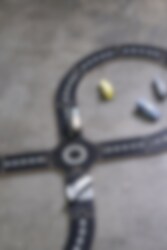 Enthält: 18 Straßenteile einschließlich eines Fassadenteils für die Ein- und Ausfahrt sowie 5 Autos in verschiedenen Farben.