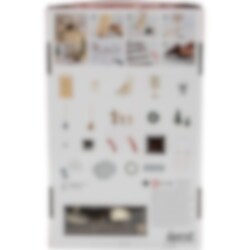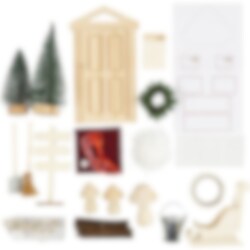 Im Set enthalten: Tür, Briefkasten, Schlitten, Straßenschild, Eimer, Schaufel, Besen, Pilze, Weihnachtsbäume, Kranz, LED-Lichterkette, Kunstschnee, Filz, Garnbommel, Holzstückchen, Schnur, Bänder, Schablonen, Klebeband und selbstklebende Punkte. Die LED-Lichterkette wird mit 2 AA-Batterien betrieben, die nicht im Lieferumfang enthalten sind.