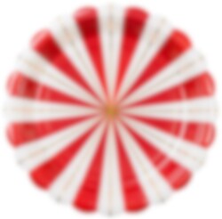 8 rot- und weiß gestreifte, luxuriöse Teller mit goldfolierten Streifen. Die Teller haben einen Durchmesser von 19,5 cm und bestehen aus Papier.