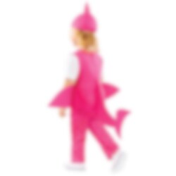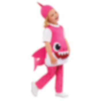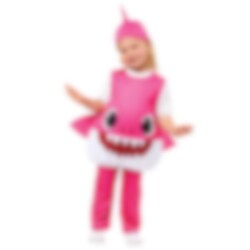 Das rosa Baby Shark Kostüm umfasst ein Oberteil, eine kurze Hose und eine passende Kopfbedeckung, die den Hai Mommy Shark aus Pinkfongs Lied Baby Shark darstellt. Das Kostüm besteht aus 100 % Polyester und ist in einer Größe erhältlich, die für Kinder zwischen 3 und 4 Jahren geeignet ist. Von Hand waschen und trocknen.