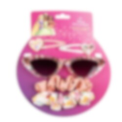 Sonnenbrille und Haar-Accessoires im Disney Prinzessinnen-Design, die jedem Tag einen besonderen Glanz verleihen. Das Set enthält eine bunte Sonnenbrille zusammen mit passenden Haarspangen und Haargummis, perfekt für Kinder, die sich an sonnigen Tagen verspielt und stilvoll kleiden möchten.