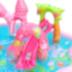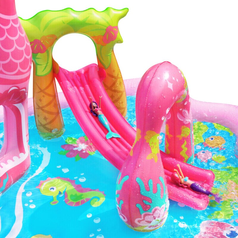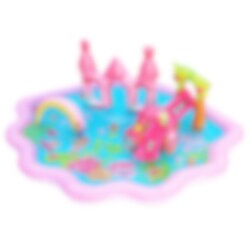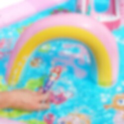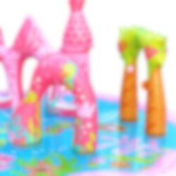 Verwandeln Sie Ihren Garten in eine magische Wasserwelt mit diesem farbenfrohen Wasser-Spielpark im Meerjungfrauen-Thema. Hier gibt es viele lustige Details, die zum Spielen, Planschen und Sommerabenteuer einladen, darunter eine Rutsche, ein Regenbogen, ein Meerjungfrauen-Schloss und kleine Figuren, die das Spiel besonders fantasievoll gestalten.