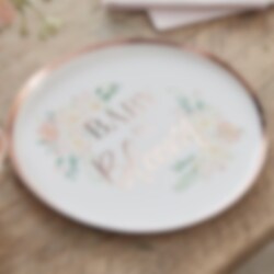 8 weiße Pappteller mit roségoldenen Folienrändern und Motiv des Textes "Baby in Bloom“ in roségoldener Folie, umgeben von wunderschönen Blumen. Perfekt für die Dekoration vor der Babyparty mit dem Thema "Baby in Bloom“. Die Teller haben einen Durchmesser von etwa 24 cm.