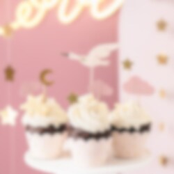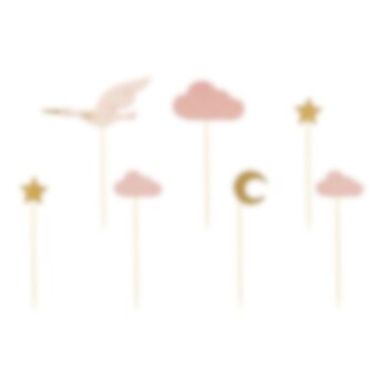 7 Cake Toppers mit Motiven von Storch zwischen Wolken, Sternen und Halbmond in rosa und goldenen Farben. Sie sind zwischen 11 und 13,5 cm hoch.