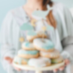 7 Cake Toppers mit Motiven von Walen, Sternen und Halbmond in Blau und Gold. Die Toppers sind zwischen 11 und 13,5 cm hoch.