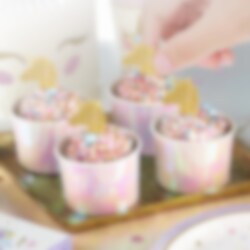 12 Cupcake Topper mit stilvollen Motiven aus goldglitzernden Einhornköpfen. Verzieren Sie die Torten oder Backwaren damit besonders schön für die Party. Die Cupcake Topper sind etwa 8 cm hoch.