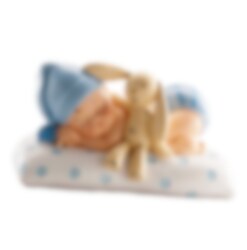 Machen Sie Ihre Torte mit dieser wunderschönen Tortenfigur, die ein schlafendes Baby in Blau mit einem süßen Kaninchen-Kuscheltier darstellt, besonders. Perfekt für Taufen, Babyshower oder Gender Reveal-Partys.