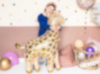Cooler Folienballon mit einer Giraffe in Hellrosa/Beige mit Punkten aus Goldfolie. Eine schöne Dekoration für die Kinder- oder Babyparty. Der Folienballon ist etwa 80 x 102 cm groß und wird mit normaler Luft oder Helium aufgeblasen.