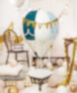 Folienballon, der einen niedlichen Heißluftballon in schönen Farben mit goldenen Foliendetails darstellt, geeignet als Dekoration für Kinderpartys und Babypartys. Der Ballon misst aufgeblasen 36 x 110 cm und kann mit Helium oder normaler Luft aufgeblasen werden.
