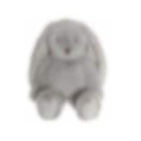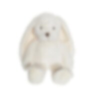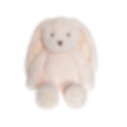 Süßes Kuscheltier in Form eines Kaninchens mit hellrosa seidigem Fell, einer braunen Garnnase und dunkelbraunen gestickten Augen. Das Kaninchen ist 30 cm hoch und bei 40 Grad waschbar. Zugelassen und CE-gekennzeichnet gemäß EN71.