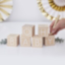 Lustige Alternative zum traditionellen Gästebuch in Form von sechs Holzklötzen aus Naturholz. Die Klötze sind auf einer Seite weiß bedruckt und bilden die Worte "Oh Baby“. Die anderen Seiten der Blöcke sind leer und bieten Platz zum Schreiben von Glückwünschen, kleinen Nachrichten und guten Ratschlägen.