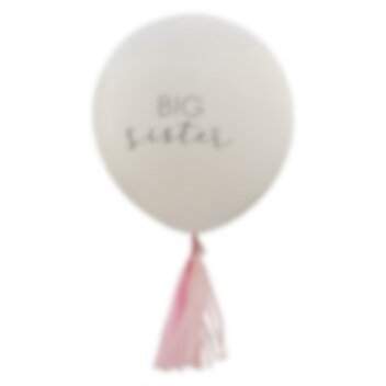 Großer weißer Ballon mit der Aufschrift "Big Sister" und feinen rosa Quasten. Der Ballon hat im aufgeblasenen Zustand einen Durchmesser von 45 cm und wird mit 2 rosa Quasten geliefert.