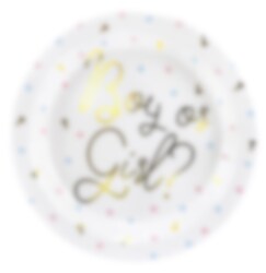 6 weiße Pappteller mit Motiven aus rosa Herzen, blauen Sternen und Fragezeichen sowie dem Text "Boy or Girl“ in Goldfolie. Perfekt, um zur Babyparty mitzubringen. Die Teller haben einen Durchmesser von etwa 23 cm.