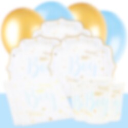 Dieses elegante Partyset für Babypartys oder Taufen bietet alles, was Sie für eine stilvolle und unvergessliche Feier benötigen. Das Set enthält 10 luxuriöse Teller mit Goldfolienrändern (21 x 21 cm), 10 süße Pappbecher (270 ml) und 20 wunderschöne Servietten mit dem Text "Boy" (33 x 33 cm).