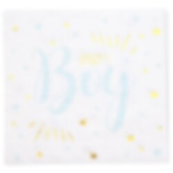 20 Servietten in weißer Farbe mit feinen Details in Hellblau und aus Goldfolie, mit dem Text Baby Boy. Super stilvoll für die Taufe oder wenn Sie eine frischgebackene Mutter mit einer Babyparty überraschen möchten.