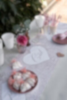 Süßer Tischläufer mit gepunktetem Muster in Rosa und Gold und wo der Text "Girl" in dekorativen Herzen entlang des Tischläufers zu finden ist. Decken Sie den Tisch mit diesem für eine Babyparty oder eine Taufe.