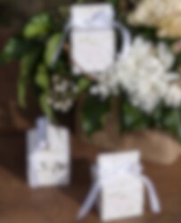 Die Boxen sind etwa 4 x 4 x 4 cm groß und werden mit einer rosa Satinschnur geliefert.