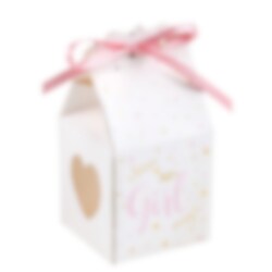 6 kleine Boxen in weißer Farbe mit dem Text "Baby Girl“ und feinen Details in rosa und goldener Folie. Füllen Sie diese mit etwas Schönem oder Leckerem und stellen Sie sie als Geschenk für die Gäste auf den Tisch, wenn eine Taufe ansteht oder Sie jemanden mit einer Babyparty überraschen.