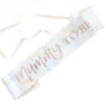 Wunderschöne Schärpe mit Blumenmuster, die die Mutter während der Babyparty tragen kann. Die Schärpe ist weiß und der Text ist mit Roségold foliert. Sie ist etwa 75 cm lang und 10 cm breit.
