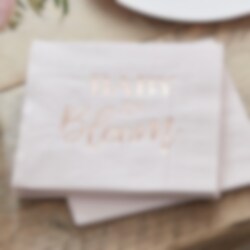 16 Servietten in blassrosa mit Motiv des Textes "Baby in Bloom" Roségoldfolie auf einer Seite. Eine schöne Tischdekoration für die Babyparty. Die Servietten hat 2-lagen und ist 33 x 33 cm entfaltet.