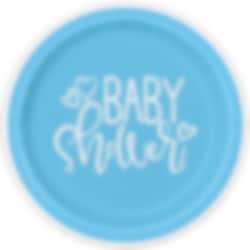 8 Pappteller in blauer Farbe mit weißen Rändern und dem weißen Text "Babyshower“ in der Mitte. Die Teller haben einen Durchmesser von etwa 22 cm.